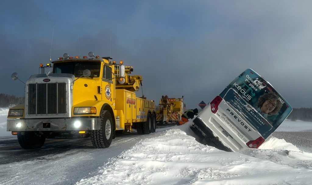 L’autobus s’est renversé doucement dans la neige molle, à un angle de près de 45 degrés.